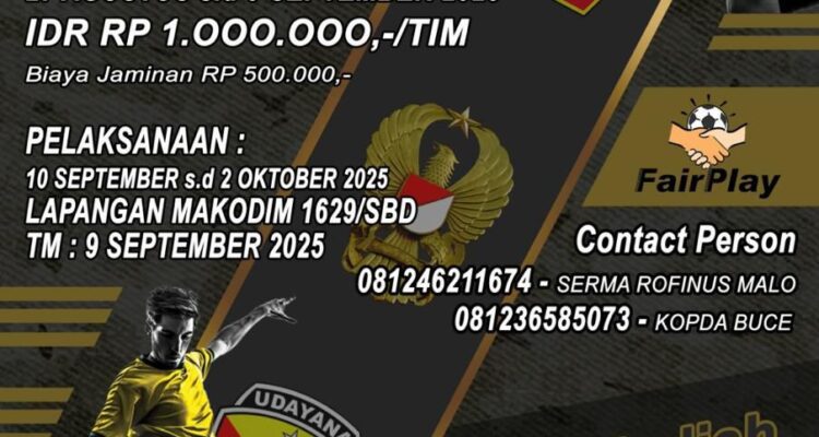 Open Turnamen Mini Soccer Dandim Cup 2025 Digelar, Total Hadiah 15 Juta Rupiah Olahraga|Agustus 27, 2025oleh Doel Haris Tambolaka, SuaraJarmas.id – Dalam rangka memperingati Hari Ulang Tahun (HUT) TNI ke-80,