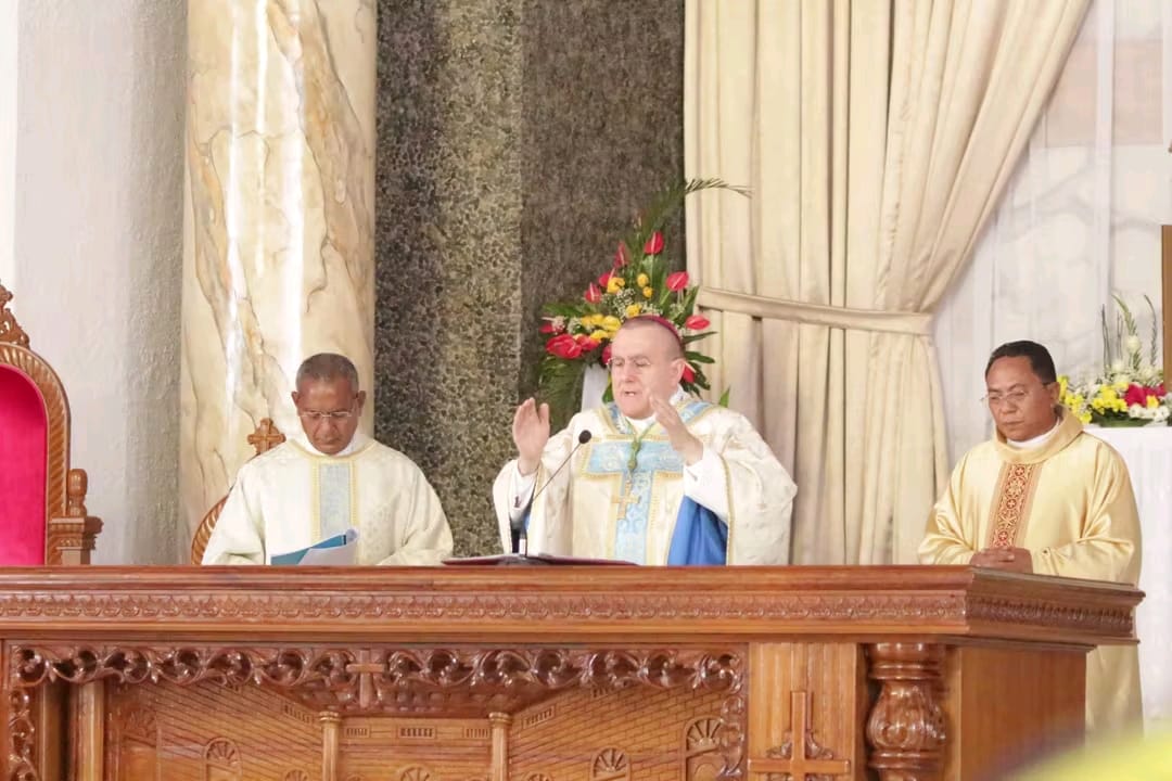 Dalam homilinya, Nunsius Apostolik Mgr. Piero Pioppo mengungkapkan kekagumannya terhadap kemegahan bangunan gereja yang berdiri anggun di atas bukit Kambajawa.